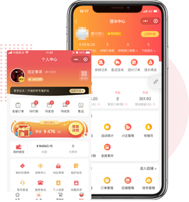 会员下单,团长收益立即可见,总部结算自由提现团长还可自营店铺售卖自营商品与平台互利互惠。