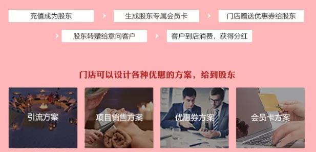 通过共享模式,把我们店里的一些粉丝顾客,通过会员变成我们的股东,既解决资金问题还不用担心客源问题,通过消费奖励来吸引股东入股,成为我们的股东。股东将自身的人脉资源发展为门店会员或消费顾客,即可获得股东名下客户的消费奖励。分红股东不参与门店管理,也不享受门店原有营业客股份奖励,仅享受由自己人脉资源消费的奖励,店家股东均无任何利益损失。